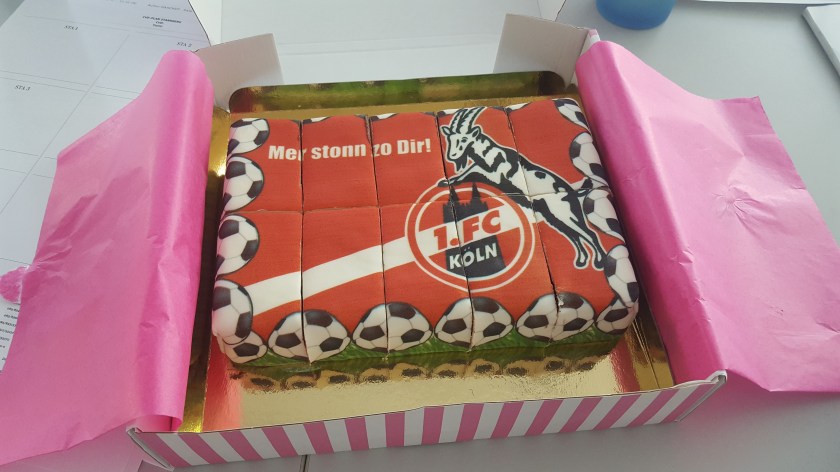 Aber nicht überall waren meine Bemühungen von Erfolg gekrönt. Beim gemeinsamen WM-Gucken etwa (einmal, dann kam Korea) musste ich mir ein paar böse Sprüche über meinen Heimatverein anhören. Und obwohl ich, zugegeben, kein sonderlich großer Fußballfan bin, ging mir das als Kölner natürlich sehr nah. Da wir uns ansonsten sehr gut verstanden haben fasste ich also einen perfiden Racheplan, der großzügigerweise nicht den Meuchelmord an meinen Kollegen beinhaltete. Anstelle des traditionellen Abschiedskuchens wollte ich meinen Kollegen am letzten Arbeitstag eine FC-Torte kredenzen. Samt Hennes und allem. Ohne das Gift.